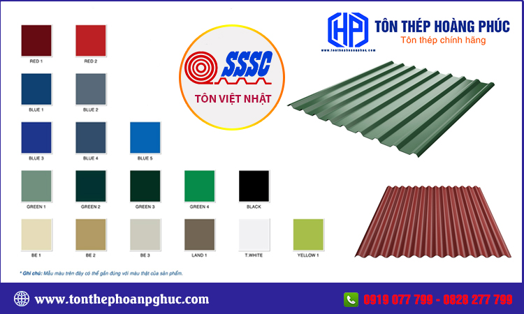 Tùy vào từng nhu cầu sử dụng của quý khách hàng mà lựa chọn mẫu tôn lạnh Việt Nhật SSSC phù hợp nhất. Xưởng tôn thép Hoàng Phúc luôn có mẫu sản phẩm tôn Việt Nhật chính hãng với đa dạng dòng sản phẩm, quy cách, quý khách có thể đến xưởng để xem mẫu hoặc liên hệ trực tiếp chúng tôi để được tư vấn, giải đáp mọi thắc mắc khi có nhu cầu sử dụng tôn thép nhé. Hotline: 0919 077 799 - 0828 277 799.